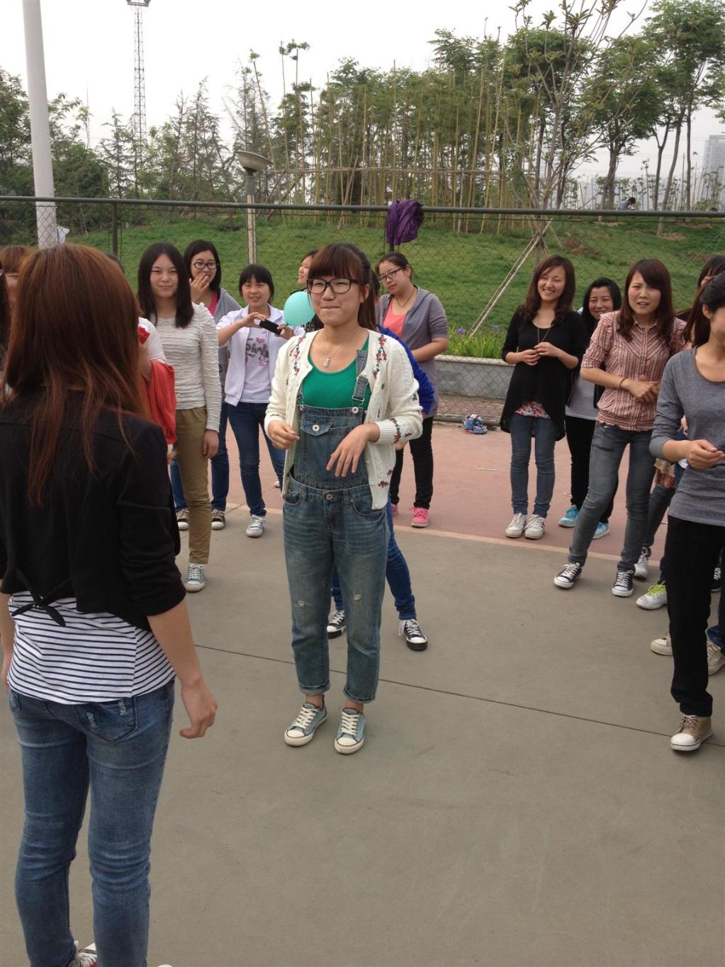 活动共分为“两人三足”、“踩报纸”、“接力传话”、“爱的抱抱”四个环节。参加活动的八个班级分为两部分,49-52班的同学在上午进行,53-56班的同学则在下午开展。虽然天气闷热,却丝毫没有削弱同学们为班级争夺荣誉的劲头。在两人三足这个充分体现团体默契度和配合能力的游戏中,56班的两名同学配合的尤为默契,率先冲过终点,赢得一份精美礼品。“踩报纸”可算是一个智力与体力并存的游戏,每组的六名同学不仅要保证站在两张四开的报纸上10秒钟,还要派出代表与其他组的同学猜拳,输掉的小组要将脚下的报纸对折后接着站上去,哪组同学能站到最后便是最后的赢家。接下来就是本次活动中最精彩的“接力传话”,每班参加的同学都拼尽全力表演各种各样的成语,丰富的肢体语言逗得在场的同学笑声不断。最后一个游戏“爱的抱抱”,让同学们在笑声中体验了运动的快乐,彻底调动了同学们的积极性,让平时只能“三点一线”活动的同学们彻底放松了身心。
