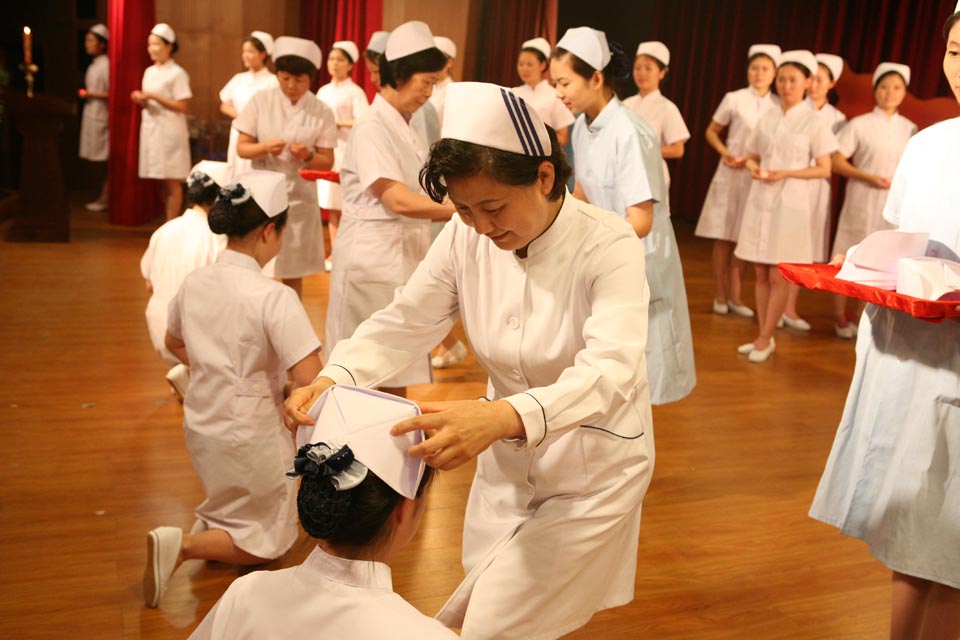学生们穿着洁白的护士服,5个一组跪在护理前辈面前,虔诚鞠躬,前辈们庄重地为她们戴上圣洁的护士帽,同时点燃象征生命之光和奉献精神的红烛。点点烛光不但传递着了老一辈护理人对新人们的期待和祝愿,也表达了毕业生对护理前辈的无限崇敬,更表达了他们献身护理事业的决心。授帽仪式后,在护理学院薛松梅老师的带领下,所有毕业生手捧蜡烛,举起右手,在南丁格尔像前进行了庄严的宣誓。在铮铮誓言中表达了自己不辱白衣天使神圣使命的决心,她们青春的脸上写满了自豪和骄傲,那激荡人心的南丁格尔誓言将激励学生为护理事业奋斗终身。