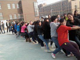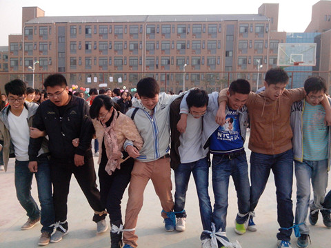 本次趣味运动会着重同学们的参与和合作,将竞技与娱乐相结合。活动共分为“拔河比赛”和“十人九足”两个环节。参与活动的8个班级,2班一组,以抽签决定各自合作的队友,组成四支强大的参赛队伍。