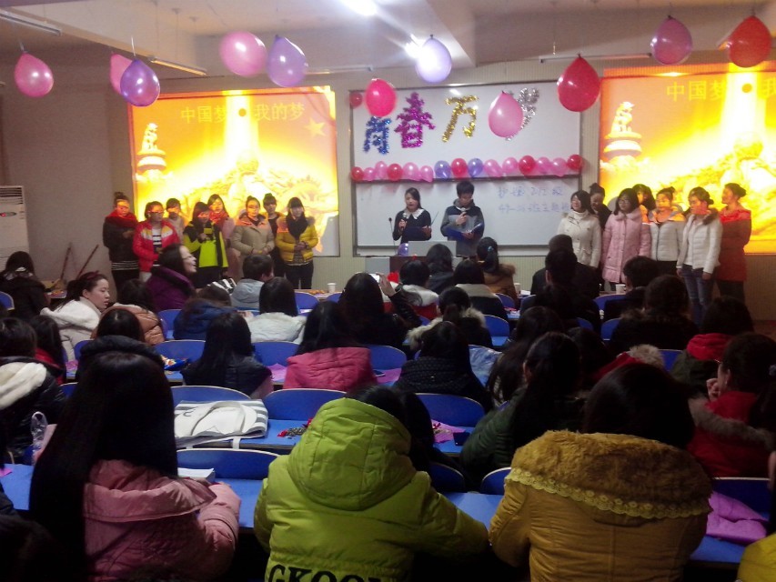 一路欢歌,一路笑语,我们向春天走来。12月23日晚上,护理学院2012级本科49-56班在平原新区第一教学楼B103教室举行了“Weareyoung,青春万岁”主题元旦晚会,外教老师Oakley、辅导员谷妍蓉老师、刘璐老师、张腾飞老师及本大班全体同学出席,我校中医养生店的成员参加并赞助本次晚会。
