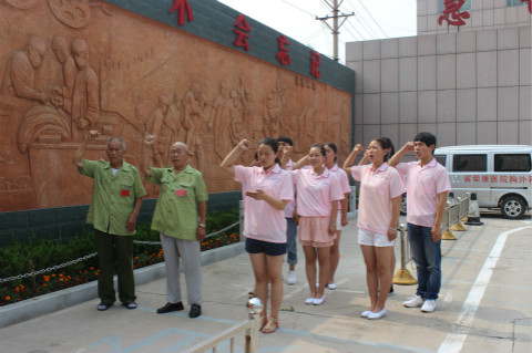 活动开始,党员志愿者们在活动中心演唱了大合唱《团结就是力量》和《精忠报国》,学生们还演唱了豫剧《穆桂英挂帅》、《说唱脸谱》,用歌声向他们传递快乐,老兵们激动的打着拍子,齐声跟唱,脸上洋溢着一种坚定的信念,以及对过去抗战岁月的缅怀。随后,志愿者们带领老荣军在功臣苑前做健康操,表达了志愿者们对老荣军身体健康、福寿安康的美好祝愿。在活动室里,志愿者们与老前辈们一起回顾了他们早年的抗战经历,他们有的参加过抗美援朝,有的参加过对越自卫反击战,有的参加过南京保卫战,有的参加过常德会战。有位老兵头上鏠了28针,有的被子弹打断了胳膊和腿。朱光武老英雄向学生们讲述了自己当兵的历史,他1946年6月1日加入中国共产党。16岁参军并在张学良的第29军任职,经历过1937年的七七事变、卢沟桥事变,因在北京作战失败,转入天津,在天津学了三年的木工,经过父亲的帮助于1942年2月1日正式加入八路军。为响应毛主席的号召“保存实力,隐蔽作战,走农村包围城市的路线”,参加了8年的游击战、5年的地道战。他详细讲述了1947年刘伯承、邓小平挺进大别山的艰苦历程。老人在作战中,经历三次大的负伤,在作战中头部被炸伤,与日本人拼刺刀左背部负伤、山东苍南战役腿部被炸伤。老人一共获得了抗日纪念章、保卫华北纪念章、保卫中原纪念章、全国解放纪念章共四次大的纪念章,并获得三次一等功。在回忆参加的战役时,老人记忆犹新,一个劲地比划着当时作战的线路和布局。之后,老人还和志愿者们对当前的社会问题进行讨论,当问到作为一名共产党员,如何以身作则,贯彻群众路线?老人的话掷地有声:“作为一名党员,要以身作则,处处真诚,为群众办事要言行一致,在言行举止方面严格要求自己,要牢记为人民服务的宗旨。”对于当代的大学生,老人说道:“抗战精神是中华民族的宝贵财富,当代大学生要牢记抗战精神,发扬抗战精神。作为医护人员,更要关心和关爱人民,做好护理治疗,细心观察病人的情况与病情,各个方面都要细心的观察,只要细心、还有爱心,就会在工作上作出成就。”老人一直向志愿者们强调劳动的重要性,并说道劳动者是最美丽的人,有劳动才会有健康。一个个激动人心的场景带志愿者们仿佛回到了战争年代,重温了战争岁月的光辉与伤痛。采访结束后,在老兵的引导下,志愿者党员与荣军党员代表一起来到文化墙,面向党旗庄严宣誓,看到老兵们神圣地对着党旗,响亮的宣读共产党誓言,同学们眼角流下热泪,一个坚定共产主义信仰老兵的情怀感染着在场所有人。宣誓后志愿者们向心目中的英雄敬礼,表达当代大学生对国家英雄的深深敬意。最后,志愿者在工作人员的带领下走进院史荣誉馆,听专业的人员给解读关于荣军医院的峥嵘岁月和风雨历程。