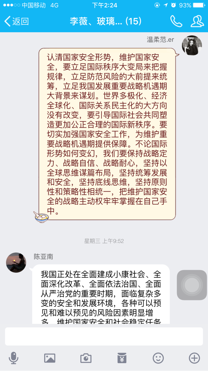 2017年2月27日上午11点,护理学院教职工党支部在QQ群讨论组室进行政治理论学习。学习的内容主要是“牢固树立认真贯彻总体国家安全观,开创新形势下国家安全工作新局面”,强调要准确把握国家安全形势,牢固树立和认真贯彻总体国家安全观,以人民安全为宗旨,走中国特色国家安全道路,努力开创国家安全工作新局面,为中华民族伟大复兴中国梦提供坚实安全保障。