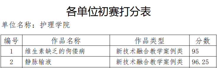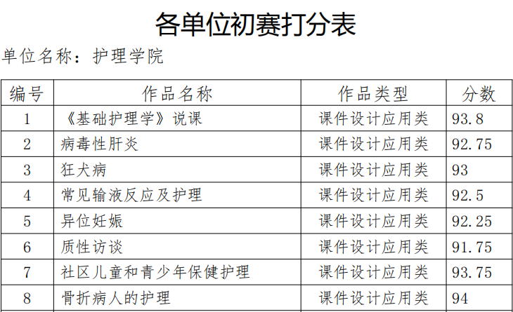 根据《新乡医学院三全学院第十一届教育教学信息化大赛实施方案》,护理学院经过积极宣传动员,共收集教育教学信息化作品24件,其中微课制作应用类14件、课件设计应用类8件、新技术融合教学案例类2件,并于2020年5月14日进行了初赛,现将结果进行公示,如有异议,请联系护理学院初赛评委会,联系方式:13781968277。