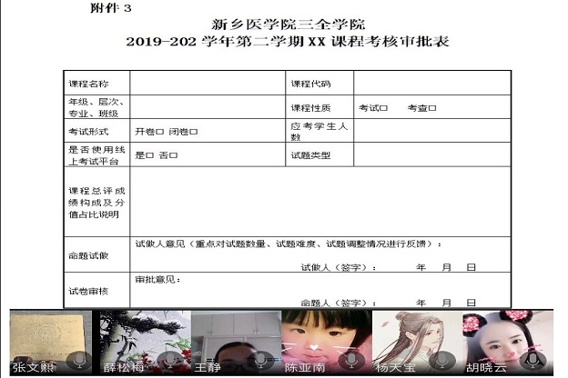 为规范线上考试,保障期末考核顺利进行,根据《新乡医学院三全学院关于做好2019-2020学年第二学期课程考核准备工作的通知》要求,6月15日9点半,护理学院在企业微信召开2019-2020学年第二学期考务会。护理学院全体教师参加。