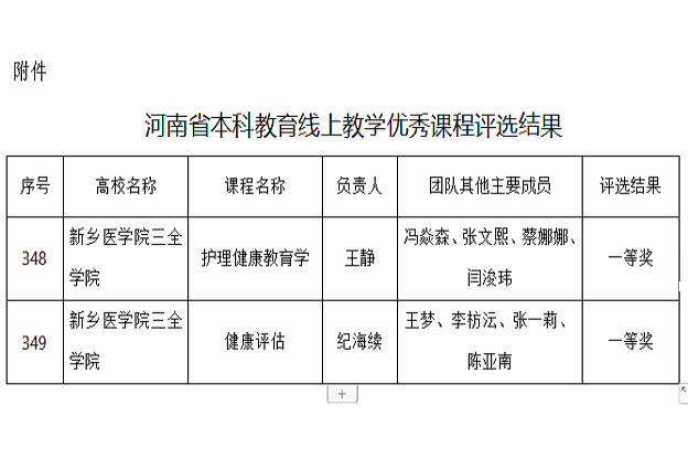 近日,河南省教育厅下发了《河南省本科教育线上教学优秀课程评选结果》,我校8门课程获河南省本科教育疫情防控期间线上教学优秀课程,其中我院的《护理健康教育学》、《健康评估》两门课程获得一等奖。