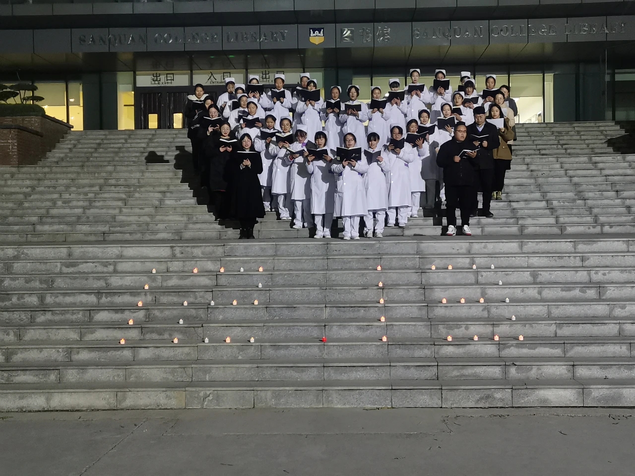 在图书馆门前的我“心”我愿活动中,工作人员提前到场在指定地点将蜡烛摆放到位,做好准备工作,然后在相关参与人员全部到场后,活动正式开始。身穿白色护士服的同学们与身着黑色正装的辅导员老师和护理学院的老师们,一同站在图书馆门前的楼梯上,并一同组成了一个巨大的“爱心”形状,伴随着沉重的音乐,老师与同学们的诵读声缓缓响起“巍巍金陵,滔滔大江,钟山花雨,千秋芬芳…龙盘虎踞,彝训鼎铭,往开来,永志不忘”,他们用青春而坚定的声音,向世界发出庄严的和平祈愿!与此同时,学校木桥东侧的手“寄”深情活动正进行着令人震撼的手语表演,护理学院后门处同学们正集体念着对南京大屠杀受害者的悼词,这些震撼人心的场面,让现场的所有人深切感受到作为青年学生,要铭记历史、不忘国耻,奋发图强,担负起中华民族伟大复兴的历史使命。在这个冬夜,沉重而又坚定的诵读声回响在这寂静的校园,也正如黑夜之中那颗最明亮的星一样,为前进道路上的行人指引方向。