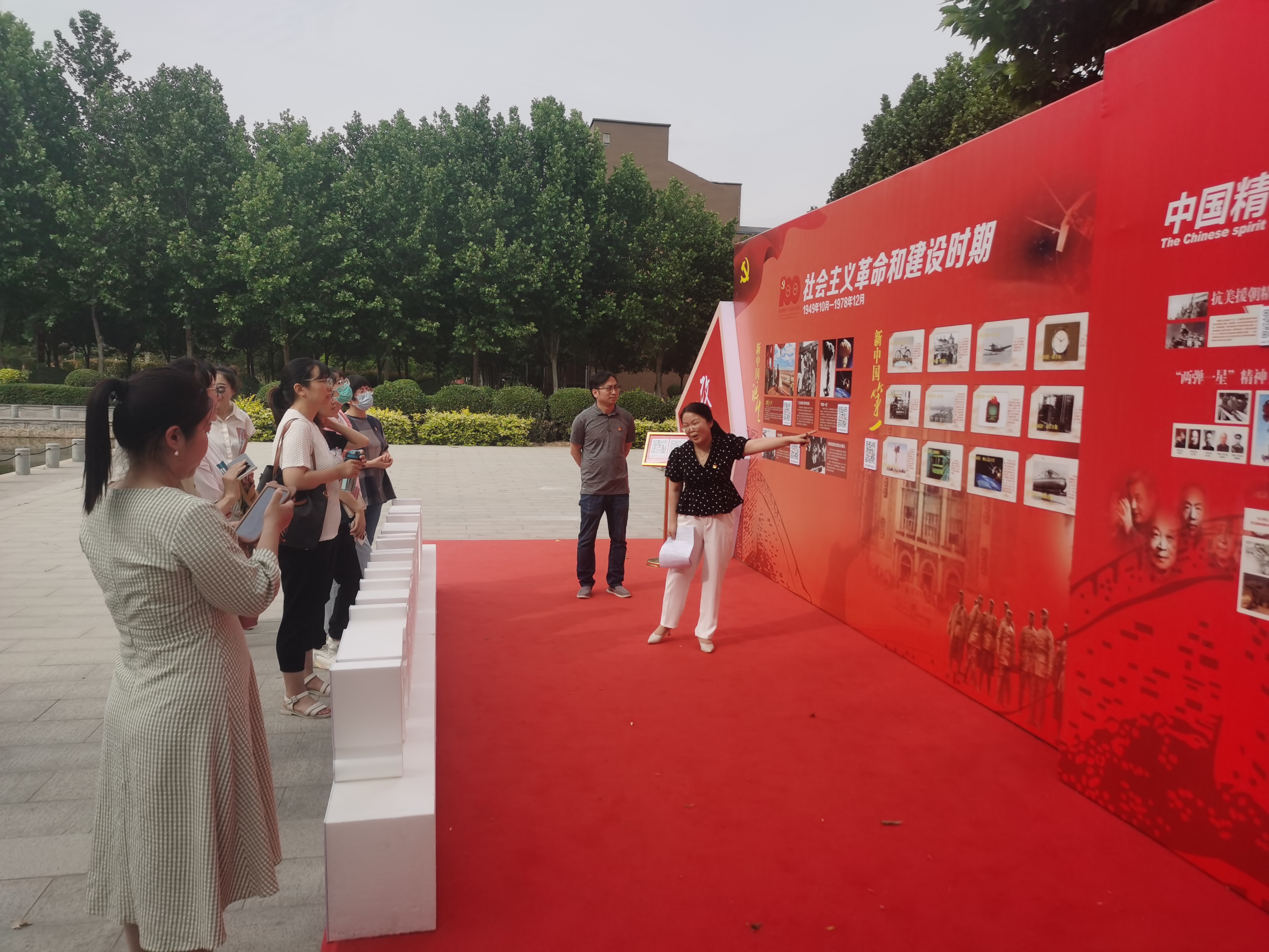 杨昕岳负责第二展区党课的实践教学,该阶段主要包括了“社会主义革命和建设时期”,从1949年10月新中国成立开始直至1978年12月党的十一届三中全会召开结束。她从三个部分给大家讲解了该时期发生重大历史事件,这三个部分分别是:新中国的诞生、新中国“第一”和中国精神三个板块。她从新中国的诞生开始讲起,着重给大家讲解新中国如何在内忧外患中一步步成长起来,她说新中国建立是来之不易的,是我们革命仁人志士用鲜血和生命换来的,所以我们都应该珍惜现在的美好生活。在新中国“第一”这个部分中,她列举了许多我国走在世界前列的“中国制造”。在中国精神部分她着重介绍了“红旗渠精神”“焦裕禄精神”等中国精神内涵和实质,希望大家在工作和生活要继承和发扬中国精神,要树立起“四个自信”。