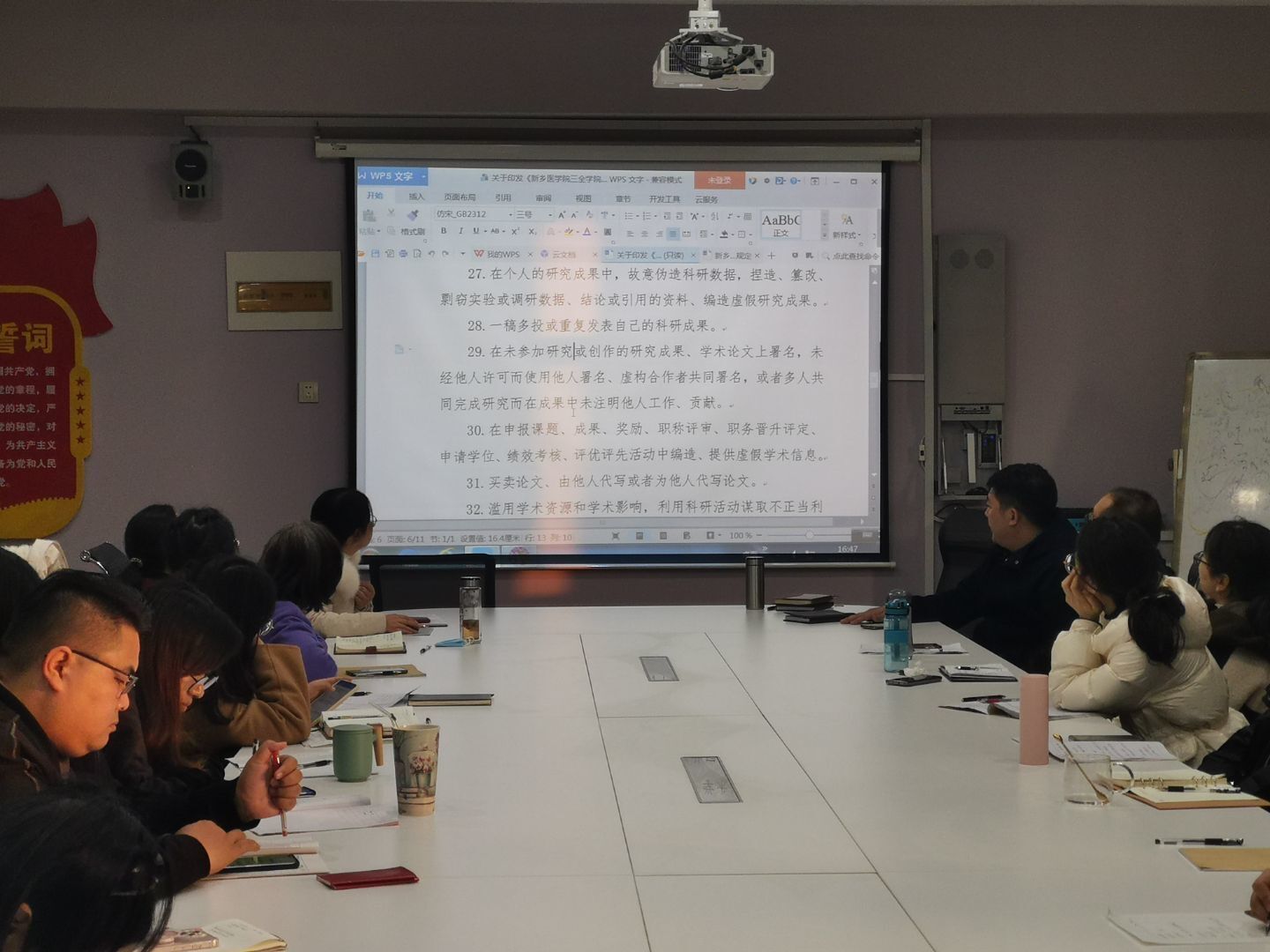 会议的第二部分,杨昕岳领学《新乡医学院三全学院教师师德失范行为负面清单及处理办法(试行)》,就实施对象及文件所列师德失范行为负面清单等多个方面进行了学习和讲解,并就近期部分高校出现的师德失范行为事件引起的舆论危机做出警示教育,传达了三全学院师德师风专题工作会议上的精神。习近平总书记关于师德师风工作多次作出重要指示和重要论述,曾多次提到“评价教师队伍素质的第一标准应该是师德师风”,学校将进一步加大师德失范行为的查处力度,把师德师风建设的各项要求和文件执行好、落实好,最终把师德师风问题防范好。