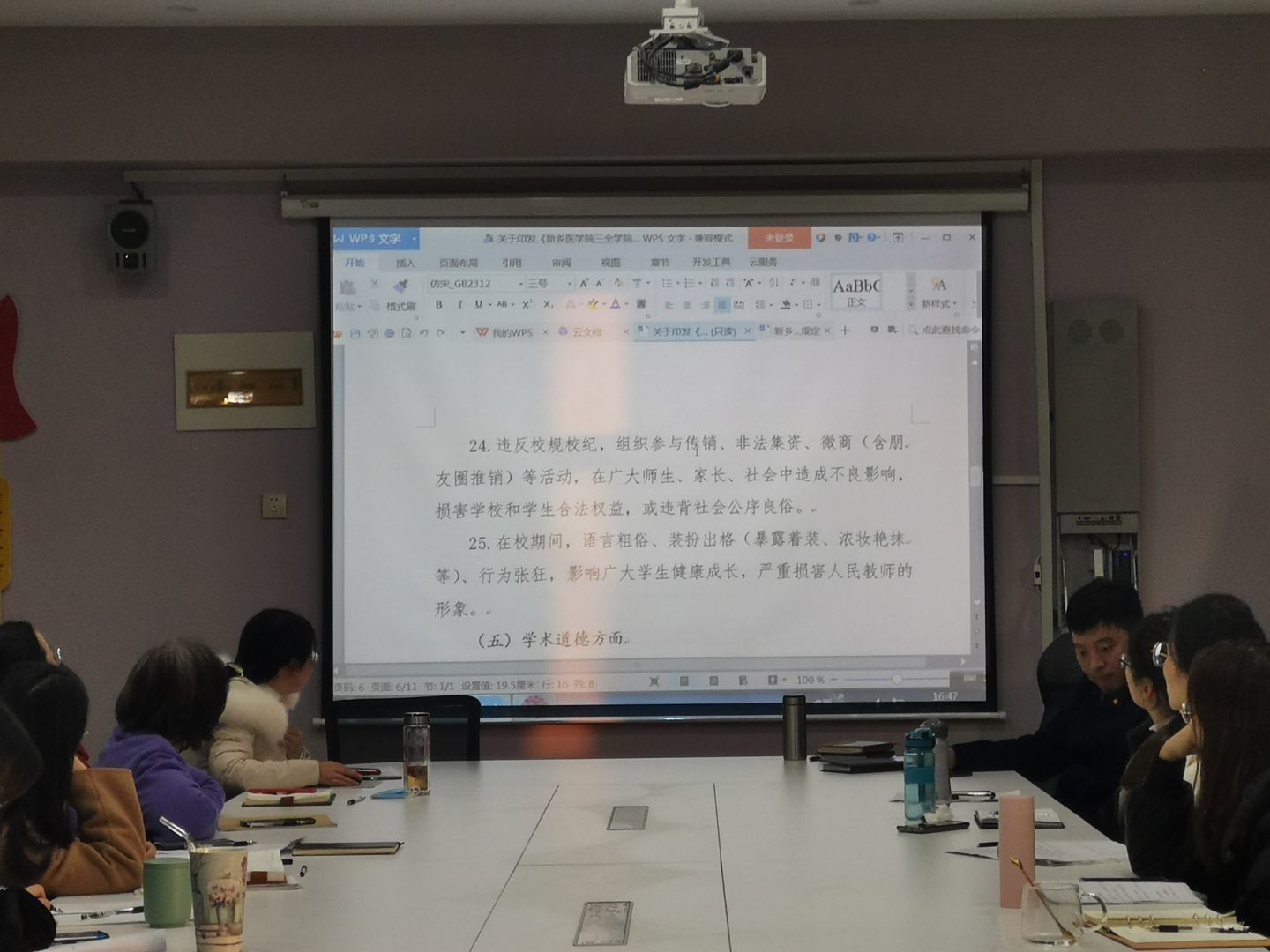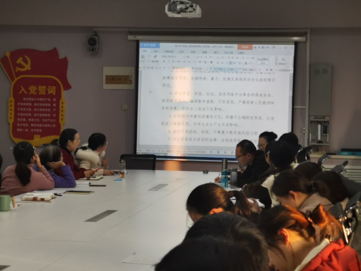 2021年12月9日,护理学院全体教职工在院系楼四楼会议室召开会议,学习保密工作相关规定、开展师德师风教育。