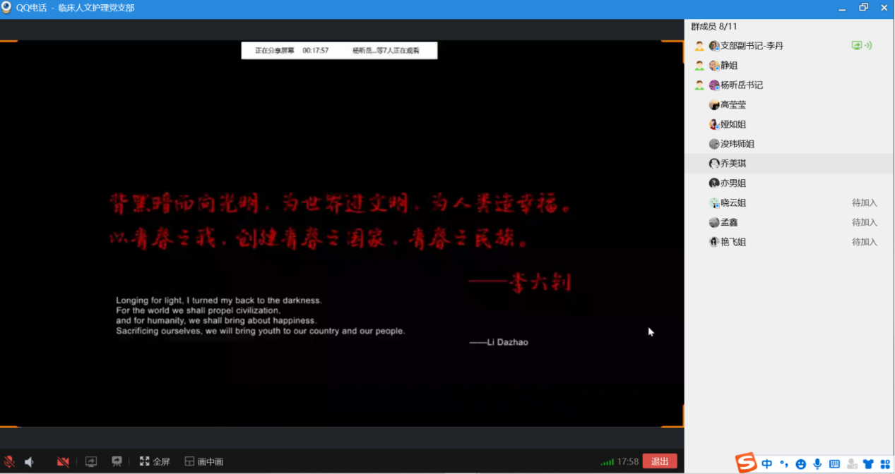 202271日下午三点,护理学院党总支临床人文护理党支部在QQ群线上开展了“迎七一”党员“政治生日”主题党日活动。活动由支部副书记李丹主持,全体党员及入党积极分子参加。