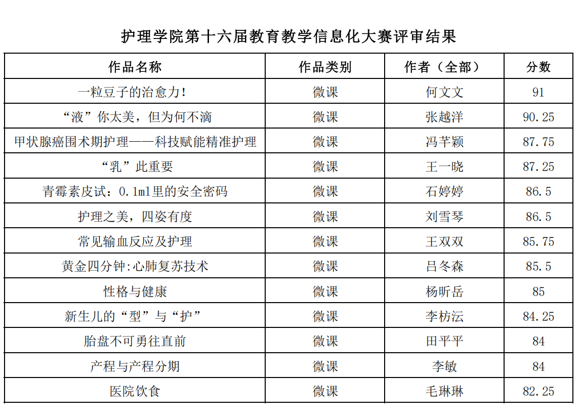 根据《豫北医学院护理学院第十六届教育教学信息化大赛方案》要求,经院系初赛,现将结果予以公示,公示期为3天。在此期间,如任何个人对评审结果有异议,请及时反馈至护理学院办公室。