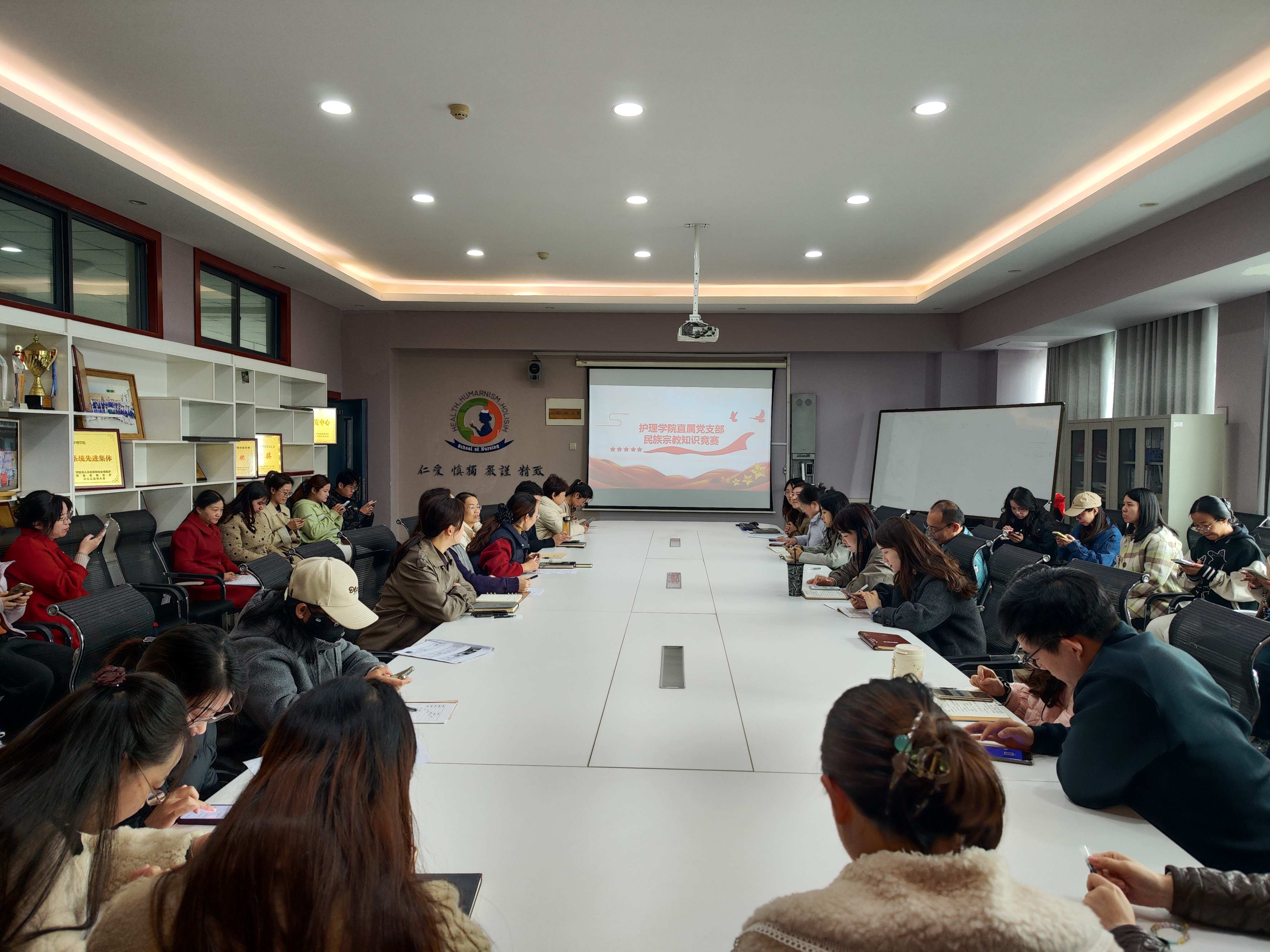 2025年10月24日,护理学院四楼会议室气氛热烈,一场聚焦民族宗教知识的竞赛活动在此精彩上演。此次竞赛旨在深化全体教师对民族宗教政策法规的理解,增强对民族宗教文化的认知,护理学院全体教师参与。
