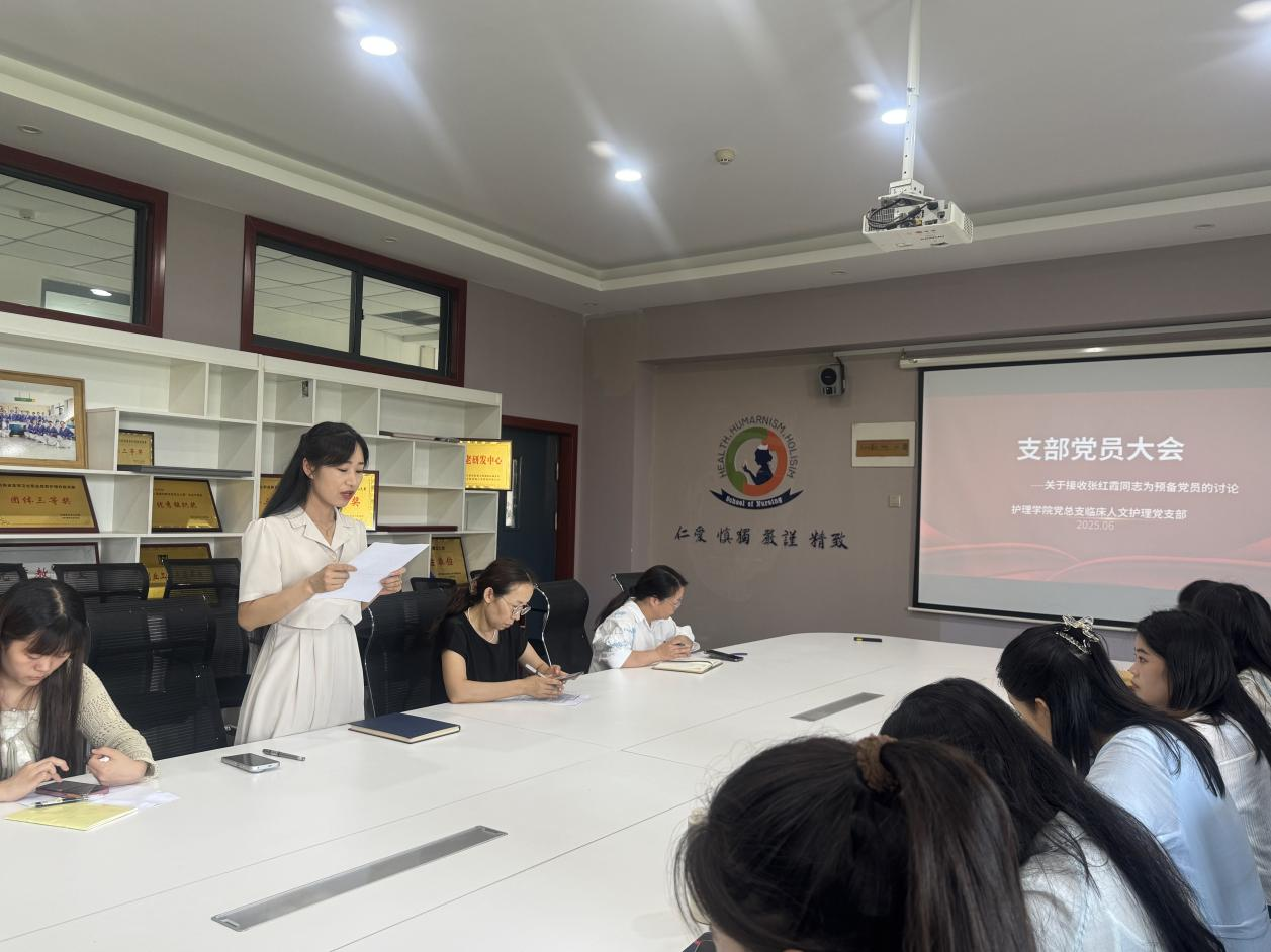 6月23日10点,护理学院临床人文护理党支部全体党员在护理学院党员会议室召开党员大会,讨论接收张红霞同志为预备党员的问题。会议由李丹同志主持,支部全体党员共同参加。首先,李丹同志介绍了到会情况:...