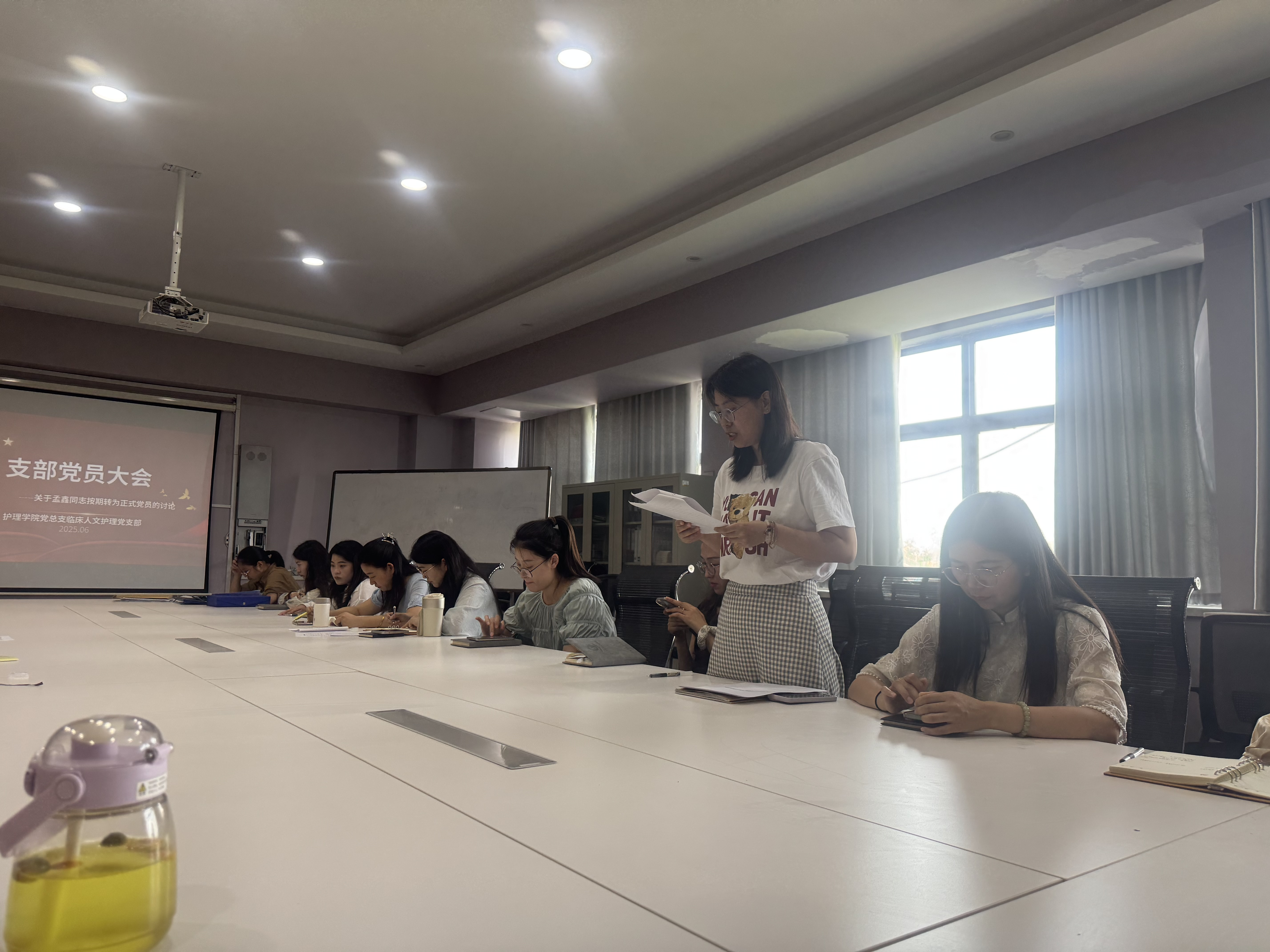 6月23日10点,临床人文护理党支部全体党员在党员会议室召开党员大会,讨论预备党员孟鑫同志的转正事宜,会议由党支部副书记李丹主持。首先,李丹同志介绍了会议流程和人员到会情况:有表决权的正式党员14...